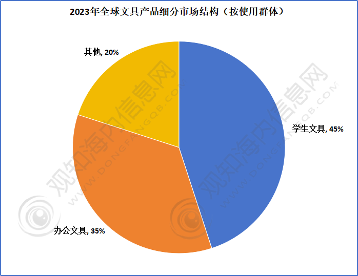 在全球市场中,文具产品主要的使用群体是学生或职工,根据Grand View Research披露的数据,其中学生用文具的占比较大,占比约为45%;办公文具的占比为35%。