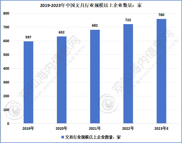 根据中国工业统计年鉴公布的数据,2019-2021年中国规模以上文具行业企业数量呈现上涨趋势,2021年中国规模以上文具行业企业数量有680余家,根据该增长趋势,初步测算2024年约有760家企业。